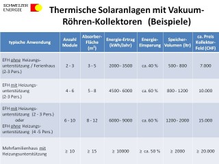 Der Gesamt-Förderbetrag einer typischen Anlage mit Vakuum-Röhrenkollektoren beträgt typischerweise 2.000 - 3.000 CHF (bei ca. 5 - 10 m2 Absorberfläche).