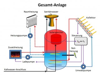 Dieses Gesamtsystem besteht aus dem Vakuum-Röhrenkollektor, dem Warmwasser-Speicher, der Anlagensteuerung und der Zusatzheizung. Insbesondere die Grösse der effektiven Absorberfläche und des Speichers müssen dabei gut aufeinander abgestimmt sein.