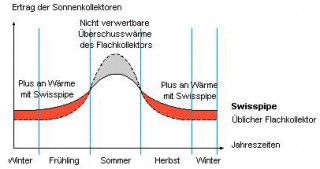 Der Bruttowärmeertrag des Sonnenkollektors SWISSPIPE beträgt im Jahr z.B bei 50 °C mittlerer Kollektortemperatur, 30° Neigung und südlicher Orientierung ca. 850 kWh pro m2 (Standort Kloten). Diese Werte sind im Prüfbericht der "Solarenergie Prüf- und Forschungsstelle" (SPF) in Rapperswil publiziert.