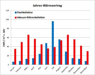 Dagegen ermöglicht der Einsatz von Vakuum-Röhrenkollektoren eine perfekte Anpassung des solaren Energieertrages an den typischen Bedarfsverlauf von Sanitär- und Heizungs-Warmwasser. Denn Dank ihrer hervorragenden Vakuum-Isolation "sehen" diese Kollektoren die Aussentemperatur so gut wie nicht. Dadurch ist ihr Wärmeertrag von der jeweis herrschenden Aussentemperatur nahezu unabhängig.